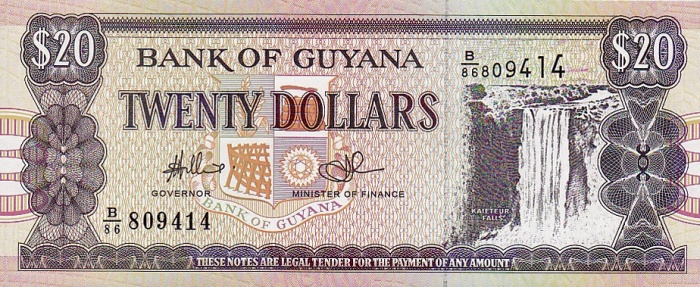 Внешний вид 20 (двадцати) гайанских долларов с изображением водопада Кайетур (аверс):