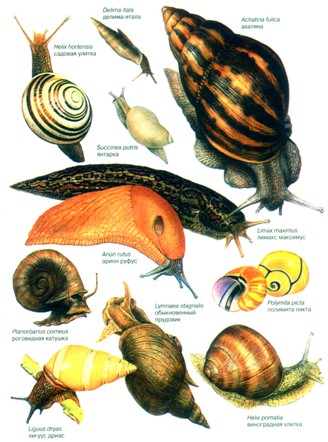 К брюхоногим относятся также слизни, которые получили свое название из-за отсутствия раковины, что вынуждает их выделять огромное количество во избежание пересыхания. Слизни обитают во влажных местах, но на суше. Питаются грибами, растениями, например, капустой и другими культурами, из-за чего портится урожай.