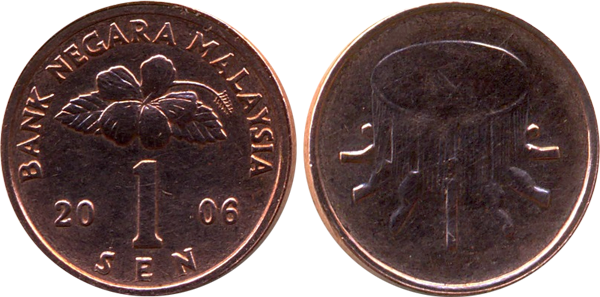Внешний вид 1 (одного) сена малазийского ринггита с изображением малазийского национального барабана Rebana на реверсе:
