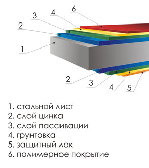 • Завершается процесс производства нанесением разнообразных полимерных покрытий, основной функцией которых является защита металла от воздействия внешних неблагоприятных факторов, а также придание готовому изделию цвета. Цена металлочерепицы зависит напрямую от вида полимерного покрытия, применяемого при ее производстве.