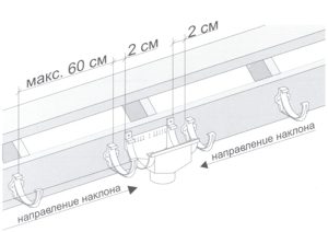 Чтобы установить жёлоб уклонённым к сливной трубе, кронштейны должны располагаться под наклоном их осевой линии (не более 5-и см на каждые последующие 10 метров).