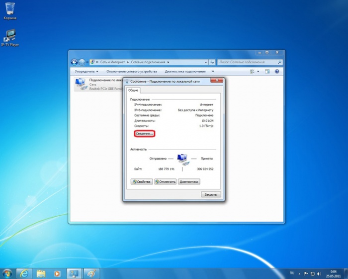 В новом окне «Состояние» - «Подключение по локальной сети» нажмите на кнопку «Сведения»…
