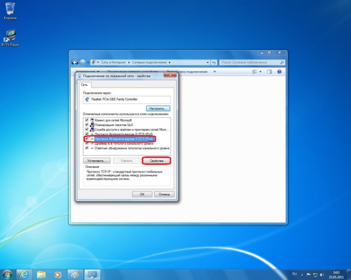 В новом окне «Подключение по локальной сети» - свойства выделите надпись «протокол интернета версии 4 (TCP/IPv4)», после чего жмете кнопку «Свойства»