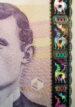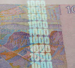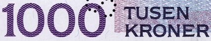 2. Степени защиты норвежской кроны – непрерывная защитная нить. При осмотре банкнота против света нить видна в виде непрерывной тёмной линии. На защитной нити размещены цифирное обозначение номинала и микротекст.