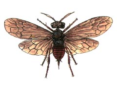 Описание: Длина тела (без яйцеклада) 5-7 мм. Оно черновато-бурое, или каштаново-бурое, у самки обычно с буровато-желтой или рыжей вершиной брюшка. Голова и грудь пунктированные, почти матовые. Голова сильно поперечная. Усики рыжие 12-члениковые, с буроватым удлиненноверетиновидным третьим члеником, и короткими тонкими остальными (4-9) члениками, суммарная длина которых короче половины длины третьего членика. Крылья буроватые, примитивной, полной системой жилок и ячеек. Ноги рыжие, с простыми коготками; голени средних ног с тремя, задних - с четырьмя предвершинными шпорами. Створки яйцеклада достигают половины длины брюшка, сбоку слегка изогнутые, сверху постепенно заостренные к вершине [1,2].